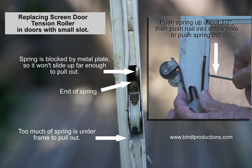 This is for screen doors with very short slot for spring, and where it’s blocked by a plate from sliding enough to simply pull out.